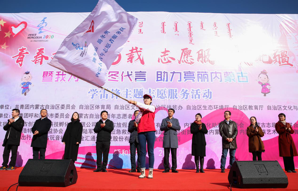 第十四届全国冬季运动会筹委会志愿者服务组副组长、自治区团委副书记刘晓宇为“迎冬运、助冬奥内蒙古青年志愿者服务队”授旗。