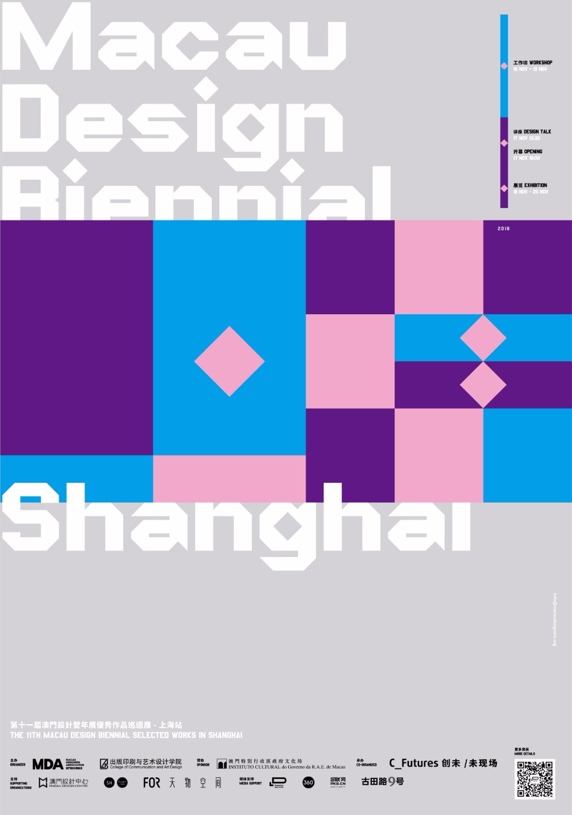 第十一届澳门设计双年展优秀作品巡回展上海站将于11月17日至25日举办。上海站共分三个部分:展览、讲座沙龙、工作坊。届时双年展评委和获奖设计师将亲临现场开办讲座和工作坊,与大家深入沟通,探讨未来设计趋势。