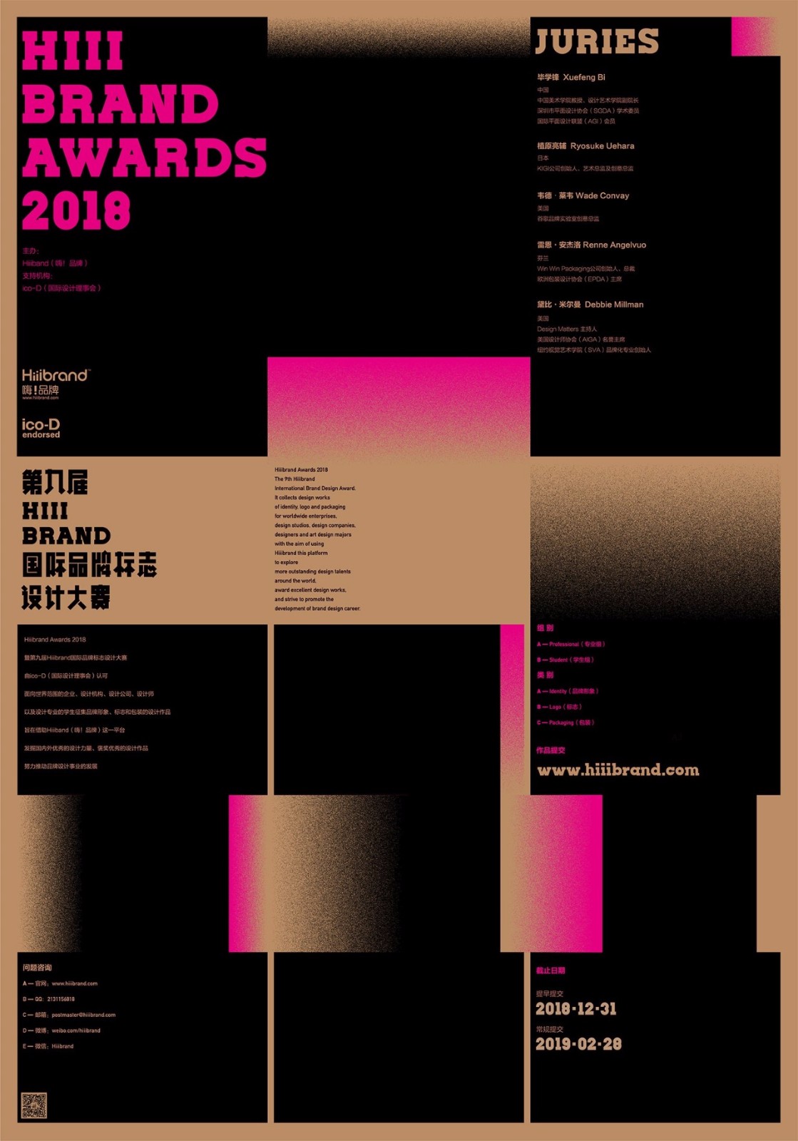 大赛分为专业组和学生组,分别设有品牌形象、标志和包装三个类别。参赛者通过在Hiiibrand(嗨!品牌)官网(www.hiiibrand.com)提交作品参与比赛。设计界资深的数位国际评委将公正地评选出全场大奖、评审奖、金奖、银奖、铜奖等获奖者。
