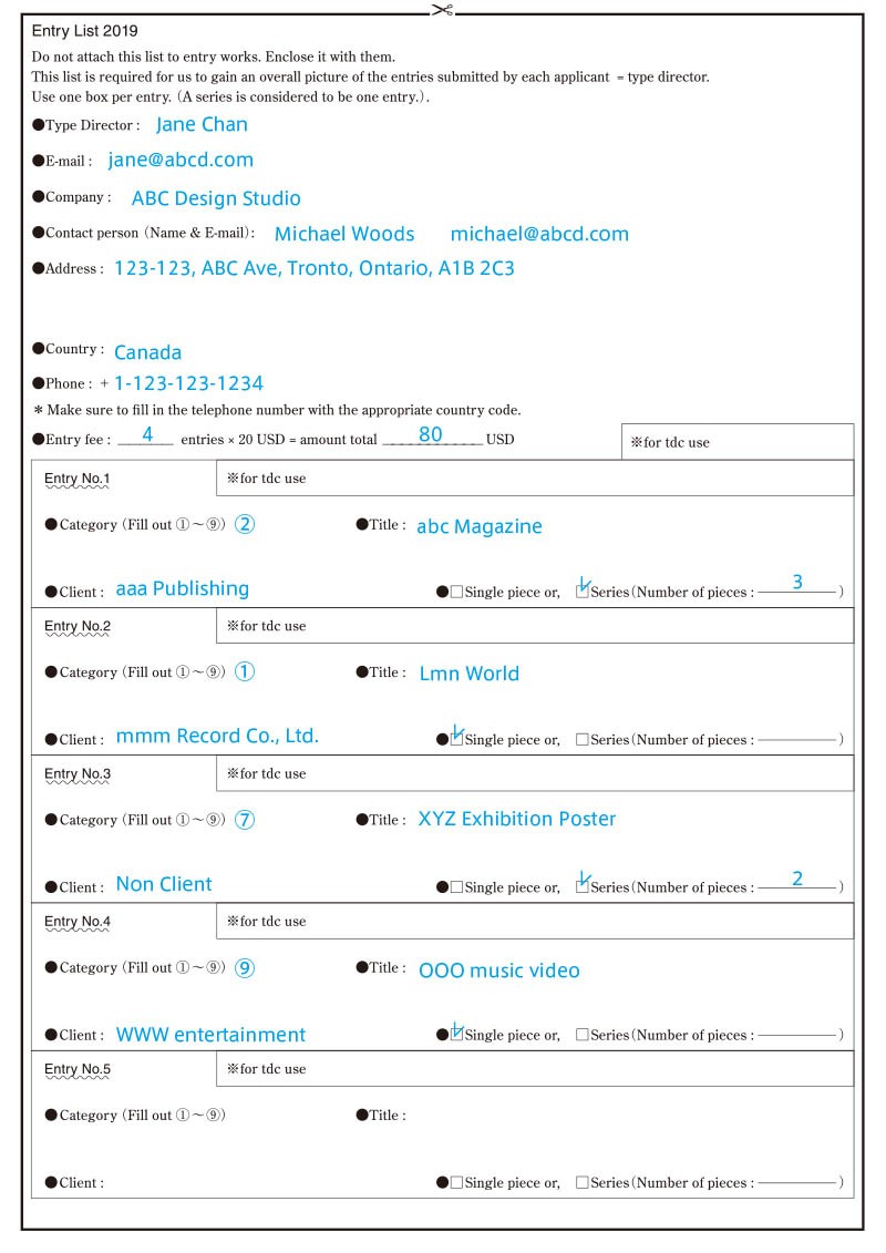 All packages must be shipped prepaid. Shipping fees must be paid by entrants. Please also note that Tokyo TDC will NOT pay any customs duties, so be sure to mark “MATERIAL FOR CONTEST ENTRY – NO COMMERCIAL VALUE” on the outside of each package and on the commercial invoice.