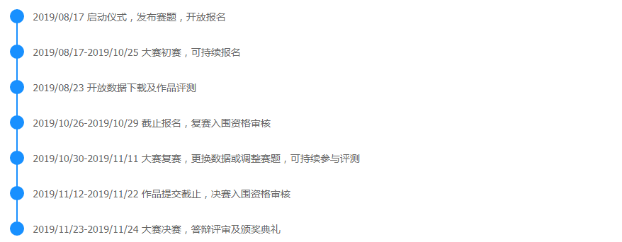 初赛阶段为初始入围拔阶段,参赛人员根据赛题描述选择自己擅长或感兴趣的一道或多道题目,报名后进行数据下载、结果提交等操作,获得成绩后进入排行榜,最终经晋级审核后,每道赛题筛选排行榜前50支团队进入复赛。