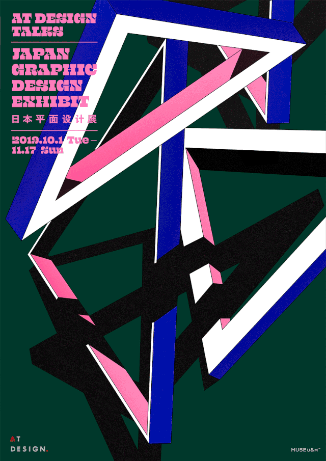 本次展览主视觉邀请资生堂首席设计师——花原正基设计。取用了AT DESIGN的LOGO中最具辨识度的圆形与三角形——在平面设计中,同时也是最为基础的图形,是一切形体变化的基础。以跃动的形式,展现日本平面设计界充满活力的一面。