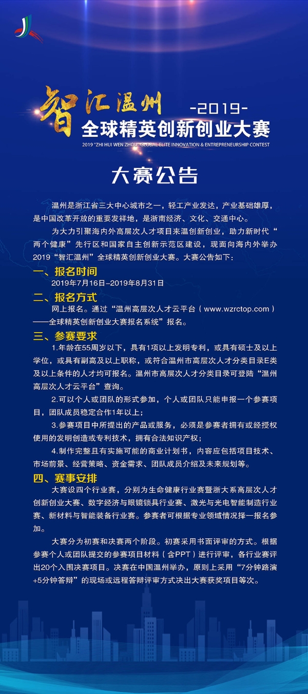 7月15日上午,2019“智汇温州”全球精英创新创业大赛新闻发布会举办。从发布会获悉,本次大赛由市委、市政府主办,市委组织部(人才办)、市科技局、市人社局、市经信局共同承办,大赛从2019年7月至11月进行。大赛还给予获奖者资源对接、资金补助、政策优惠、创业辅导等支持,获奖者最高可获3000万元建设资助。