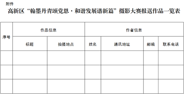 六、收稿地址及联系方式本次大赛采取网络投稿方式,仅收电子版原图作品,请将参赛作品电子版报高新区党工委宣传统战部。邮箱:lygxqzpzj@163.com,联系人:杨琳秋,联系电话:7109187。附件:高新区“翰墨丹青颂党恩和谐发展谱新篇”摄影大赛报送作品一览表。