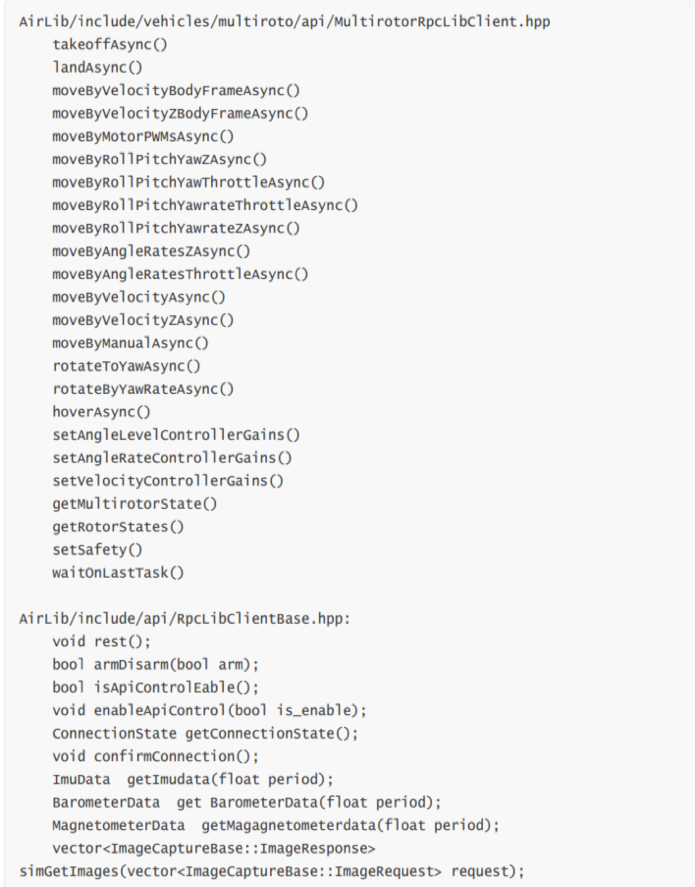 鼓励方案和真机方案相同或近似,采用ubuntu + ROS的编程方式。比赛可用API见附录,不可用GPS等API,我们第一版提供的AirLib直接编译于master分支的AirSim,并未注释掉GPS等相关API,方便大家调试,但注意比赛的时候禁止使用除了下面的其他API函数。