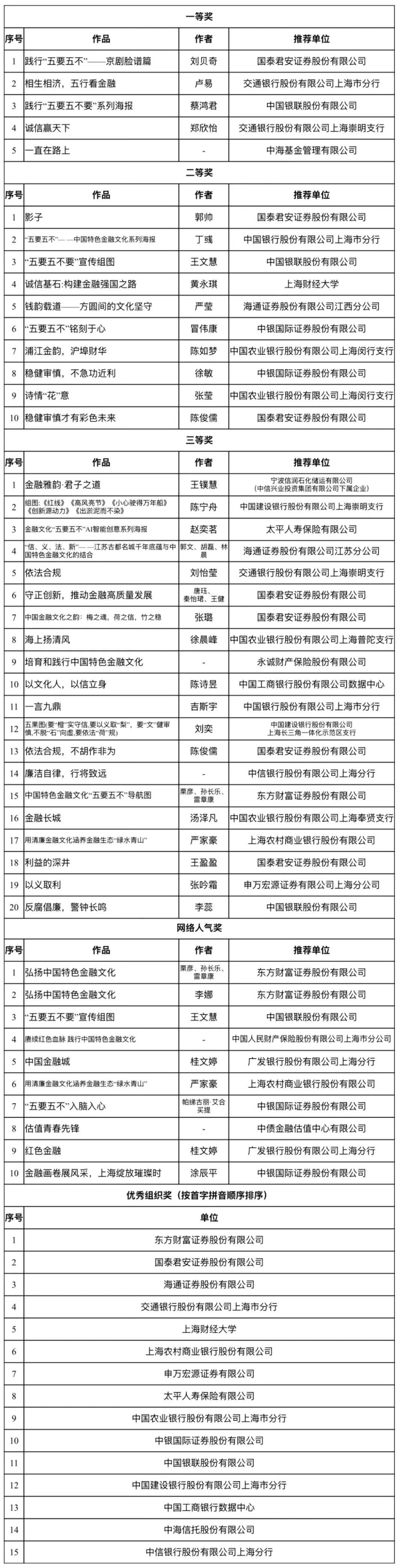 经网络投票、专家评审和市金融工作党委研究,国泰君安证券股份有限公司《践行“五要五不”——京剧脸谱篇》等5幅(组)作品获一等奖,中国银联股份有限公司《“五要五不要”宣传组图》等10幅(组)作品获二等奖,中国银行股份有限公司上海市分行《一言九鼎》等20幅(组)作品获三等奖,中国人民财产保险股份有限公司上海市分公司《赓续红色血脉 践行中国特色金融文化》等10幅(组)作品获网络最佳人气奖,中国农业银行股份有限公司上海市分行等15家单位获优秀组织奖。