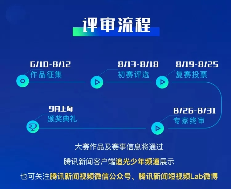 本次大赛进程将在腾讯新闻客户端“追光少年”频道,微信公众号“腾讯新闻视频”,微博@腾讯新闻短视频Lab实时更新大赛信息。