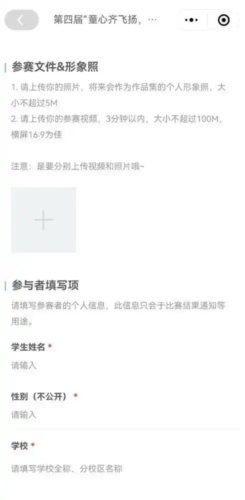 第三步:点击“+”上传作品和照片,并逐一填写参赛者信息,到最后点击“提交”。