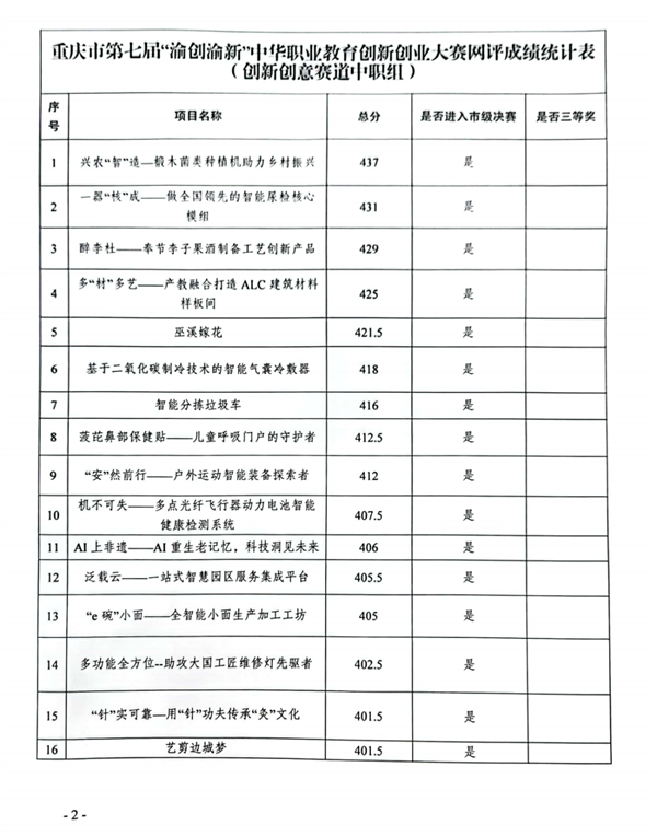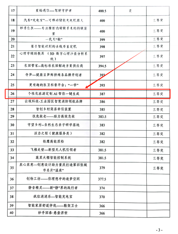根据重庆市第七届“渝创渝新”中华职业教育创新创业大赛工作方案和《关于举办重庆市第七届“渝创渝新”中华职业教育创新创业大赛的通知(渝职社【2023]41号)》要求,经专家对参赛项目进行网络评审及现场评审会评审,按照去掉一个最高分一个最低分,计算其余专家总分为项目最后成绩的原则,中职组、高职组、本科组分别有17个、22个、5个项目(共44个)进入市级决赛现场答辩环节角逐一、二等奖;同时根据复赛(网评)成绩,拟获得三等奖的项目共有46个。我校2023级旅游服务与管理专业的姚泽黎、何文武、杨柳三位同学组成参赛团队(指导老师:余爱平、杨磊),最终其提交的参赛作品《个性化旅游定制AI帮你一键生成》喜获重庆市中职组创新创意赛道三等奖。”