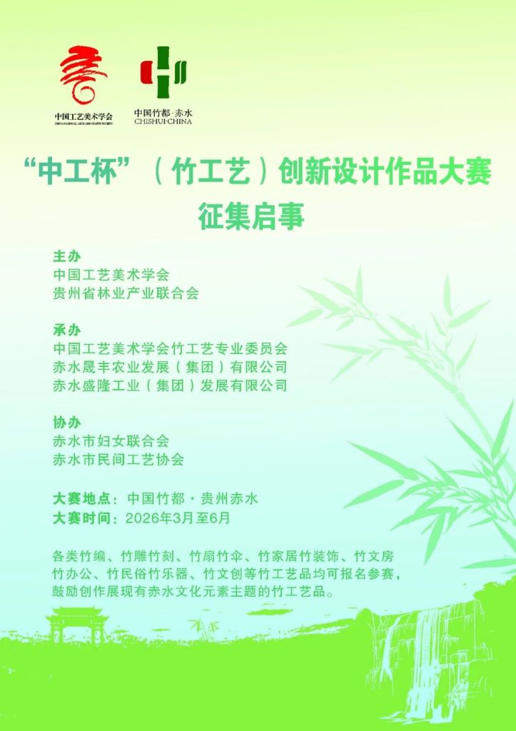 为深入践行习近平总书记“绿水青山就是金山银山”理念和“把小竹子做成大产业”的重要指示精神,深入挖掘竹工艺文化,传承竹工艺技艺,创新竹工艺产品,培育竹工艺人才,推动竹工艺产业高质量发展,中国工艺美术学会、贵州省林业产业联合会和赤水市有关单位拟于2026 年6月在中国竹都·贵州省赤水市联合举办 “中工杯”(竹工艺)创新设计作品大赛,现将大赛征集启事发布如下: